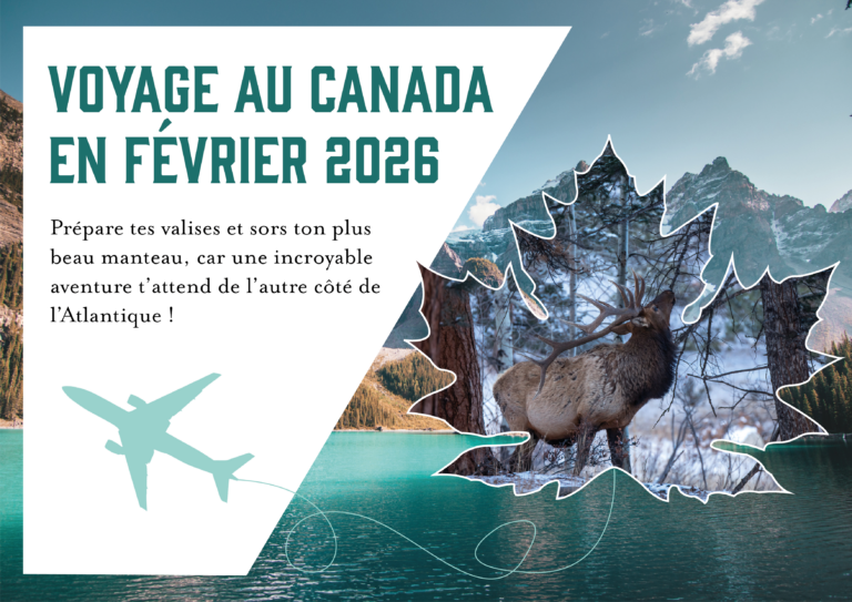 Cette affiche a été réalisée sur Illustrator et Photoshop. Elle annonce un voyage au Canada. J'ai décidé de l'illustrer avec des photos du Canada, la feuille d'érable emblématique et un avion.